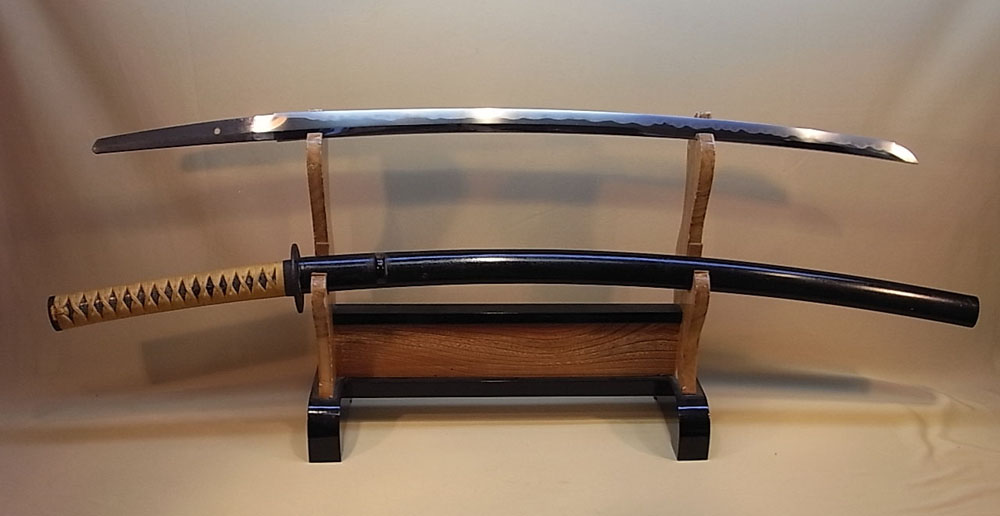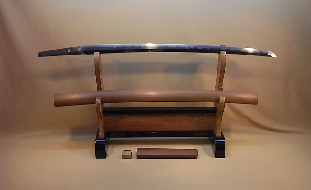 地金、小板目に美しく地沸が付き杢目ごころや板目流れが緩やかに交じり、刃文直調の のたれ刃で沸えが深く付き足、葉が良く入り冴えています、帽子直調で先小丸に返る。