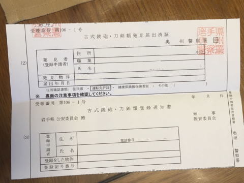 発見届(刀剣を発見した所轄の警察署が発行 ) |