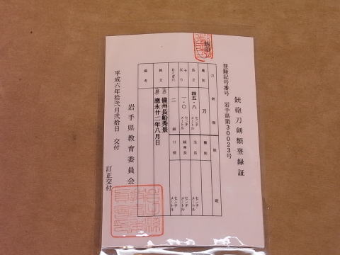 - 「刀剣類発見届出済証」を交付してもらいましたら都道府県主催の銃砲刀剣類登録審査会に発見届と刀剣を持参しますと下記の写真のような登録証を発行されます。(登録代金6300円)