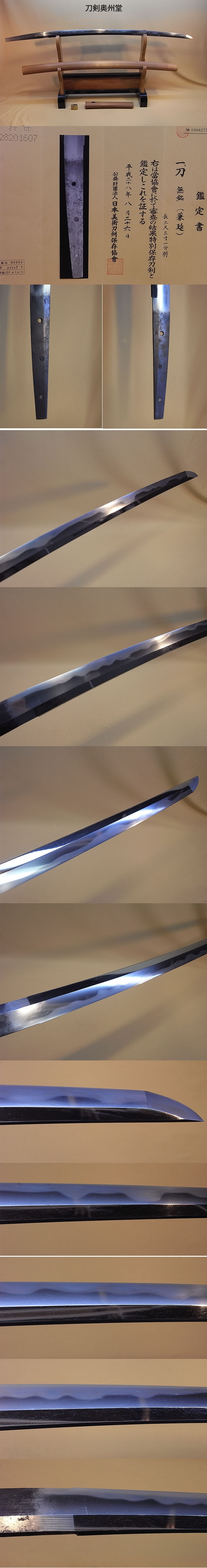特別保存刀剣 兼延 [種別]刀 [登録]大分県教育委員会 [銘文表]備前守祐国 [銘文裏] [刃長]69.8 [反り]1.4cm [元幅]3.0cm [元重]0.65cm [先幅]2.1cm [先重]0.4cm [目釘]3個内2個埋め個 [ハバキ]金着せ2重 [刀身重量]700g 85万円(送料、,消費税込み)